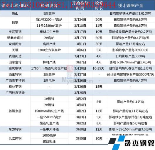 据不完全统计,截至3月28日超20家无缝厚壁钢管厂家发布检修计划。其中,检修时间最长的是湖北金盛兰,计划自3月17日对2#高炉进行检修两个月,预计影响铁水产量约0.4万吨/天,复产时间5月16日。