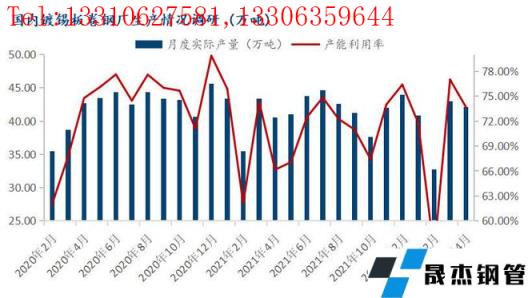 调研数据显示:据监测的26家镀锡板生产企业中,共计49条产线,2022年4月份产能利用率73.68%,月环比下降3.31%,同比下降1.09%;4月实际产量42.14万吨,月环比减少0.87万吨,同比减少0.55万吨。从4月份供应看,月环比小幅下降,主要是江苏地区部分无缝厚壁钢管厂家因疫情影响,原料供应收到影响,导致该区域马口铁产量收到影响。从历年马口铁供应看情况看每月40-45万吨处于相对正常水平,3-4月国内马口铁供应恢复正常水平。