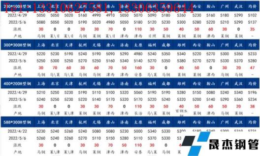 价格方面:截止5月6日,全国14个主要市场平均价格情况:200*100H型钢全国均价5137元/吨,环比上周价格上涨35元/吨;300*300H型钢全国均价5280元/吨,环比上周价格上涨47元/吨;400*200H型钢5234元/吨,环比上周价格上涨38元/吨;588*300H型钢5269元/吨,环比上周价格上涨38元/吨;5#角钢5461元/吨,环比上周价格上涨44元/吨;16#槽钢为5430元/吨,环比上周价格上涨45元/吨;25#工字钢为5520元/吨,环比上周价格上涨49元/吨,详见下表。