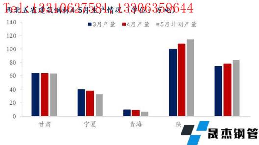 陕西区域:5月陕西主要无缝厚壁钢管厂家建筑厚壁无缝钢管总产量114.7万吨,其中螺纹钢计划产量86.8万吨,较4月增加7.3万吨;线盘计划产量27.9万吨,较4月减少0.1万吨。
