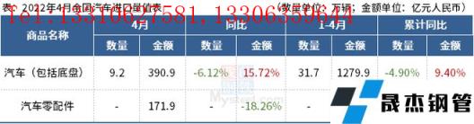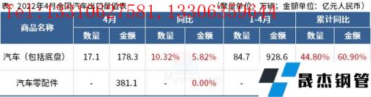 海关总署2022年5月9日数据显示,2022年4月中国出口汽车17.1万辆,同比增长10.32%。1-4月中国进口汽车84.7万辆,同比增长44.80%。
