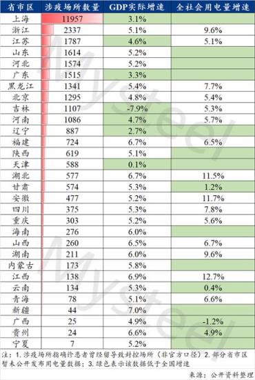 表1.截至5月7日全国省份涉疫场所数量与一季度GDP、用电量增速排名