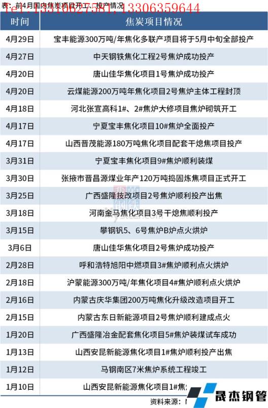 据不完全整理,2022年前4月国内有21个焦炭项目开工、投产。其中,河北张宣高科、张掖市晋昌源煤业和内蒙古庆华集团等焦炭相关项目开工;宝丰能源、中天钢铁、山西晋茂能源和河南金马等焦炭项目投产。具体内容如下: