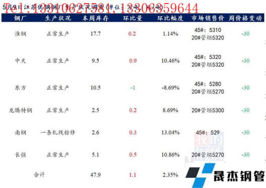江苏优特无缝厚壁钢管厂家棒材总库存47.9万吨,较上周增加1.1万吨,环比增2.35%,较去年同期上升10.48万吨,同比增28.01%。