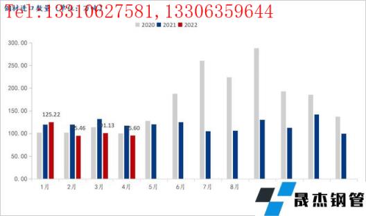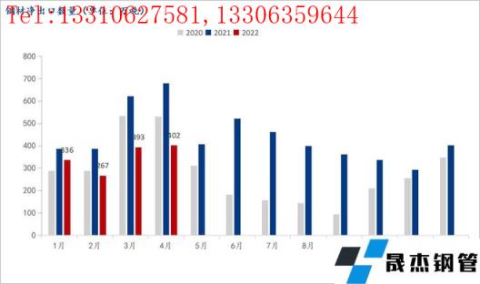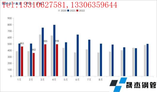 前言:海关总署5月9日数据显示,2022年4月中国出口厚壁无缝钢管497.7万吨,较上月增加3.2万吨,同比下降37.6%;1-4月累计出口厚壁无缝钢管1815.6万吨,同比下降29.2%。4月中国进口厚壁无缝钢管95.6万吨,较上月减少5.5万吨,同比下降18.3%;1-4月累计进口厚壁无缝钢管417.4万吨,同比下降14.7%。
