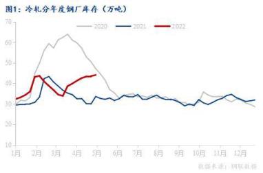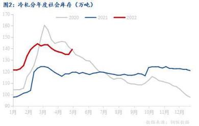 截止5月4日,监测的26个城市库存,冷轧板卷社会库存为139.41万吨。社会库存虽未到达年内的峰值,但也同样处于相对高位。年同比增加19.97万吨,同比数据同样惊人。主要是汽车、家电等制造业,在疫情下产量纷纷出现下滑,终端用钢量明显缩量。但短期局部区域物流受疫情防控影响,厂库无法向社库端去进行转移,因此社库的累积速度并不及厂库。