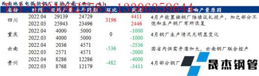 4、贵州地区4月电弧炉无缝厚壁钢管厂家日均建筑厚壁无缝钢管产量为8286吨,环比减少482吨,降幅5.50%;同比减少4000吨,降幅32.56%。4月检查组进驻贵州,贵州地区开展安全大检查,部分电弧炉无缝厚壁钢管厂家生产受到影响,加之建材价格低洼,废钢价格坚挺,无缝厚壁钢管厂家延续亏损,停产检修较多,产量环比小幅下降。