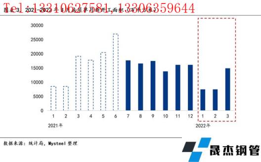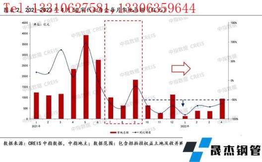 那么,预判今年用钢情况的话,可以参考从2021年-2022年4月份以来的50家代表房企每月拿地总额数据,假如往前倒推6个月,2022年1月起的房地产用钢情况大致可以参照2021年7月起的拿地数据,因为它并非一一对应的关系。我们可以看到,从2021年10月以来的拿地数据不容乐观,单月同比跌幅持续低于-50%水平线以下,预示接下来三季度的房地产新开工以及其用钢情况理论上应该是很差的。