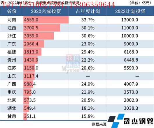 据不完全统计,截至5月10日,已有13个省份公布其2022年一季度重点项目完成投资情况,合计完成投资2.2万亿元,其中河南省一季度完成投资4559亿元,排名第一,占年度计划的33.7%。