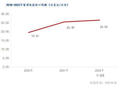 2022年一季度中国家用电器出口均价为26.54万美元/万台,2021年一季度家用电器出口均价为25.83万美元/万台。