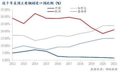 拜登此次提到的取消关税,针对的是2018年7月后开始的“惩罚性”关税,与钢铁关税有所区别,除非宣布同时取消,否则只会间接影响国内厚壁无缝钢管市场。根据美国商务部公布数据显示,近十年来美国厚壁无缝钢管进口量在2000万吨—4000万吨之间,欧洲、加拿大、墨西哥为美国前三大厚壁无缝钢管进口国,而来自中国的进口比例并不高。从图中可以看出,2018年美国加征钢铁关税以后,来自欧洲的进口比例有所下降,加拿大、墨西哥的进口比例有所上升,而中国的进口比例变化不大。即使后期钢铁关税取消,国内对美厚壁无缝钢管出口影响有限。