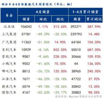 据统计,截至5月11日,4月销量与上年同期相比,比亚迪销量增速依然最为明显。具体来看,比亚迪销量106042辆稳居第一,环比增长1.11%,同比增长313.6%;其次是上汽集团销量37781辆,环比下降49.29%,同比下降25.03%,值得一提的是吉利汽车销量增幅最大,高达552%。受疫情影响,4月份绝大部分新能源车企销量全线大跌,上汽、广汽、小鹏等自主品牌车企无一例外集体销量下滑,跌幅超过两位,而比亚迪却一直占据领先地位,销量不仅没跌,还一直保持稳增长。