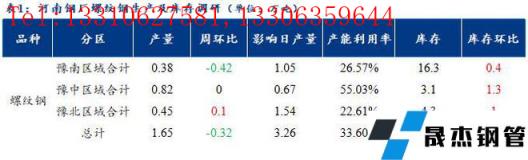 1、调研数据显示,统计的河南地区10家建筑厚壁无缝钢管样本无缝厚壁钢管厂家中,河南省建材无缝厚壁钢管厂家螺纹钢日产量1.65万吨;检修/限产影响建材日产量为3.26万吨,产能利用率为33.6%,较上周下降6.52%。