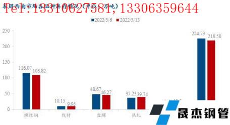 据调研,截止2022年5月13日,西南市场厚壁无缝钢管累计社会库存为218.58万吨,环比减少6.14万吨,降幅2.73%。分省份来看,本周四川市场厚壁无缝钢管库存为83.59万吨,环比增加1.08万吨,涨幅1.31%;重庆市场厚壁无缝钢管库存为69.55万吨,环比减少1.15万吨,降幅1.63%;贵州市场厚壁无缝钢管库存为27.03万吨,环比减少4.57万吨,降幅14.46%;云南市场厚壁无缝钢管库存为38.41万吨,环比减少1.5万吨,降幅3.76%。
