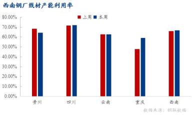 贵州区域:个别无缝厚壁钢管厂家停产检修尚未恢复生产,线材产能利用率64.24%,环比下降4.28%;开工率75%,环比持平;周产量3万吨,环比减少0.2万吨。