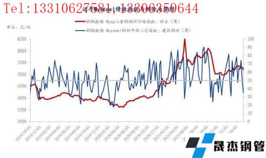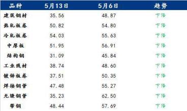 具体各品种指数来看,5月13日建筑厚壁无缝钢管情绪指数为35.56,较5月6日回落13.31;热轧板卷情绪指数为50.82,较5月6日回落3.98;冷轧板卷情绪指数为54.03,较5月6日回落1.6;中厚板情绪指数为51.95,较5月6日回落4.96;结构钢情绪指数为31.09,较5月6日回落14.75;工业线材情绪指数为38.74,较5月6日回落9.86;镀锌板卷情绪指数为37.51,较5月6日回落12.84;焊接厚壁钢管情绪指数为47.48,较5月6日回落7.79;无缝厚壁钢管情绪指数为35.23,较5月6日回落27.27;带钢情绪指数为48.44,较5月6日回落9.25。