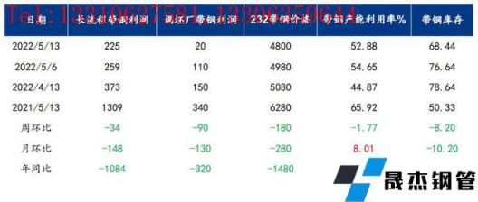 据调研结果显示,5月11日调研结果显示:本周唐山地区主流样本无缝厚壁钢管厂家平均铁水不含税成本为3665元/吨,平均钢坯含税成本 4721元/ 吨,周环比下调105元/吨,与5月11日当前普方坯出厂价格 4640元/ 吨相比,无缝厚壁钢管厂家平均毛利润-81元/吨,周环比下调45元/吨。据调研,截止目前唐山地区样本企业社会库存为49.42万吨,周环比增加3.34万吨,月环比下降9.84万吨,年同比下降12.44万吨。从坯料角度看来,当前钢坯利润为负,且库存处于相对合理范围,对价格或有一定支撑。