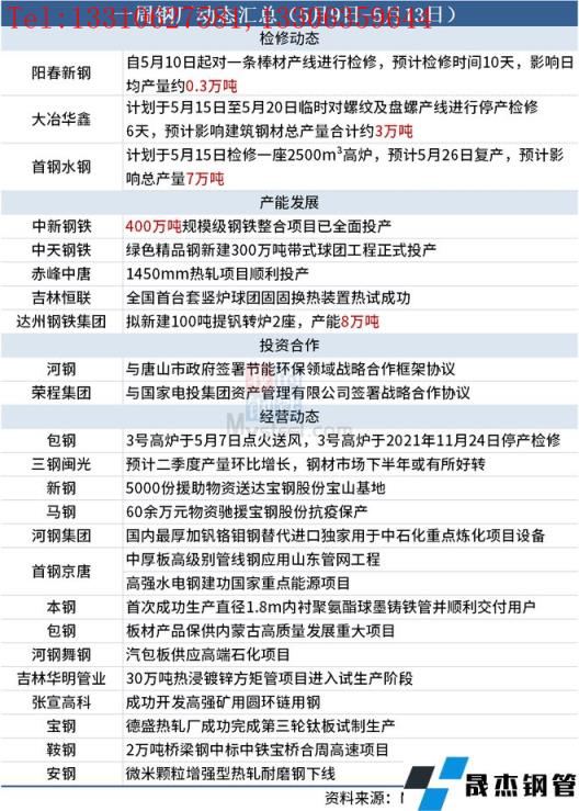 据不完全统计,本周(5月9日-5月13日)有3家无缝厚壁钢管厂家发布检修计划,具体如下: