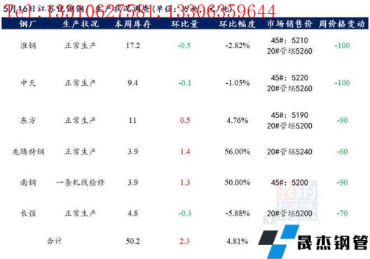 江苏优特无缝厚壁钢管厂家棒材总库存50.2万吨,较上周增加2.3万吨,环比增4.81%,较去年同期增加13.41万吨,同比增36.45%。
