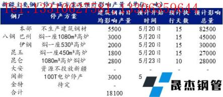 根据初步减限产方案,八钢本部4座高炉全开,但不生产建筑厚壁无缝钢管,预计影响建筑厚壁无缝钢管产量5500吨/日,巴州和伊钢基地各焖一座高炉,预计影响建筑厚壁无缝钢管产量分别为3000吨/日和2000吨/日;昆玉焖一座高炉,预计影响建筑厚壁无缝钢管产量1800吨/日;昆仑和闽新无缝厚壁钢管厂家建筑厚壁无缝钢管停产十天,预计分别影响建筑厚壁无缝钢管产量2800吨/日和3000吨/日;大安钢铁资源暂不投往新疆区域;金特待定。