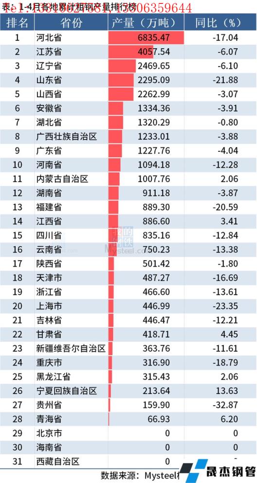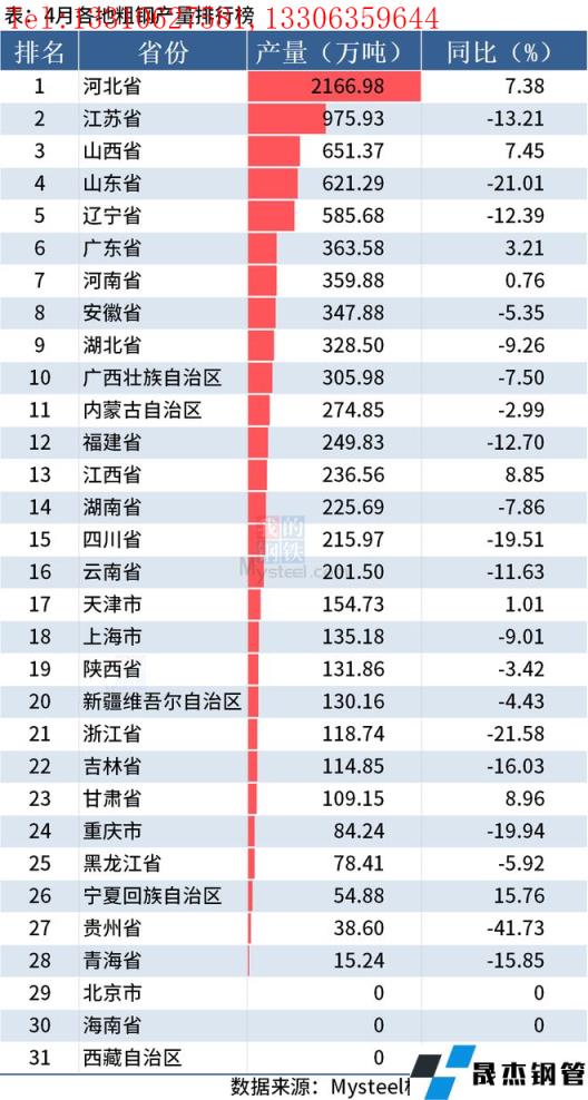 从分省数据来看,2022年前4月13个省市粗钢产量同比降幅超10%。其中河北降17.04%、山东降21.88%,河南降12.28%、福建降20.59%、四川降12.84%、云南降13.38%,天津降16.69%、浙江降13.61%、上海降23.35%、吉林降12.21%,新疆降11.61%、重庆降18.79%和贵州降32.87%。具体情况如下: