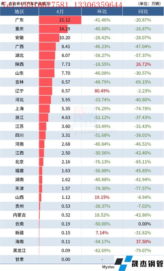 从同比来看,我国2022年4月汽车产量实现负增长。其中共24个省份汽车产量下降。其中,北京市全年汽车产量同比大降85.11%;其次为黑龙江省,下降79.07%;第三为天津市,下降77.57%。此外,全国仅海南省和陕西省4月汽车产量同比有所增加。