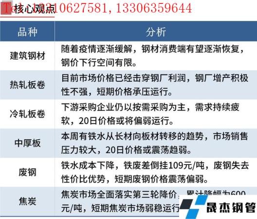 建筑厚壁无缝钢管:5月19日,全国31个主要城市20mm三级抗震螺纹钢均价4832元/吨,较上个交易日下跌42元/吨。本周由于无缝厚壁钢管厂家亏损减产,螺纹钢产量小幅下降,厂库继续上升,社库继续下降,同时表观消费小幅下滑。短期来看,目前市场基本面依然偏弱,但由于价格持续下跌已经导致部分区域无缝厚壁钢管厂家出现减产、停产情况,供给仍然维持低位。随着疫情逐渐缓解,厚壁无缝钢管消费端有望逐渐恢复,钢价整体下行空间有限。因此预计20日国内建筑厚壁无缝钢管价格或将窄幅震荡为主。
