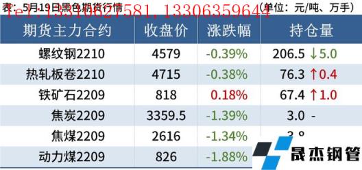 热轧板卷:5月19日,全国24个主要城市4.75mm热轧板卷均价4924元/吨,较上个交易日下跌43元/吨。近期相关重点城市疫情得到不同程度的好转,但市场需求依然有明显承压,还没出现明显改善,但目前市场价格已经击穿无缝厚壁钢管厂家利润,无缝厚壁钢管厂家增产积极性不强,短期供给依然将维持相对低位。另外今日数据发布,本周热轧无缝厚壁钢管厂家产量下降0.89万吨,厂库下降2.19万吨,社库下降3.29万吨,表需继续下降,整体来看短期成材依然将承压运行。