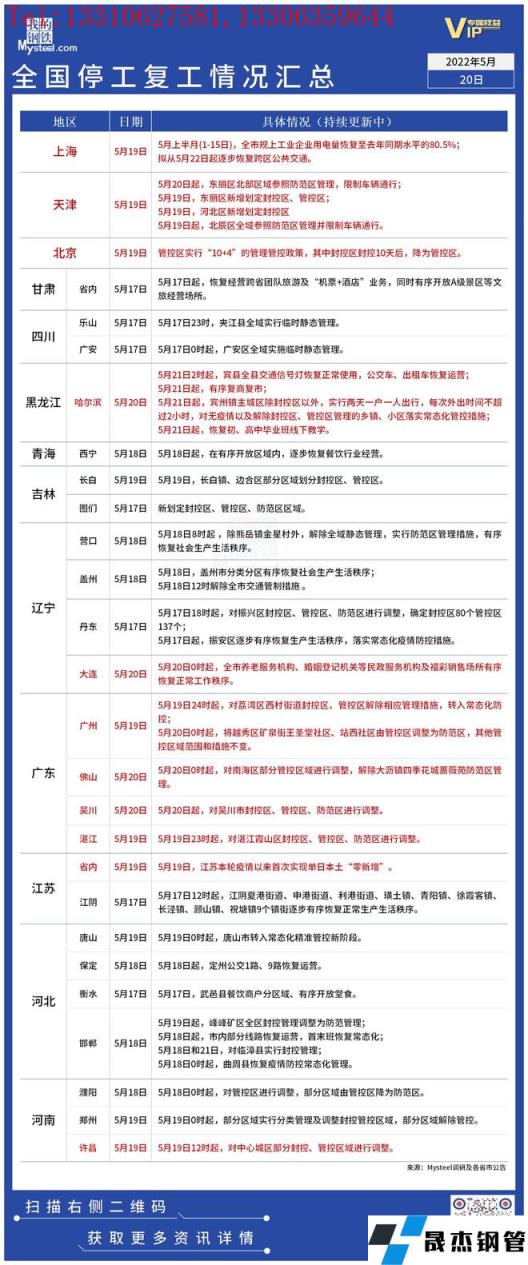截至5月20日,据不完全统计,共有13个省市发布了停工复工最新信息。北京管控区实行“10+4”的管理管控政策,其中封控区封控10天后,降为管控区。上海拟从5月22日起,逐步恢复跨区公共交通。广东多市调整封控区、管控区。江苏本轮疫情以来首次实现单日本土“零新增”。具体情况如下: