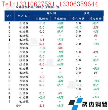 据4月底的调研,5月东北无缝厚壁钢管厂家螺纹和盘线的计划产量分别为119.5万吨和95.9万吨,同比减少57.1万吨和26.3万吨,环比增加10.5万吨和12.3万吨;受市场价格下行影响,无缝厚壁钢管厂家亏损幅度扩大,部分多品种生产的无缝厚壁钢管厂家根据各品种的亏损幅度和订单情况进行品种间的转产,单一生产螺线的无缝厚壁钢管厂家部分复产、部分加大减产,具体情况如下: