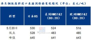 进入5月,日本东京制铁废钢采购价格已经历了六连跌,5月份的关东铁源出口招标会,又再现流标局面。据调研,截止5月20日,日本HS废钢到岸价在530美元/吨左右,距离4月初的高点大幅下降115美元/吨,近乎已回到年内低点;截止5月20日,美国HMS1:2(80:20)废钢到岸价在524美元/吨,距离4月份的高点跌117美元/吨,离年内低点约41美元/吨;截止5月20日,欧洲HMS1:2(80:20)废钢到岸价在516美元/吨,距离4月份的高点跌127美元/吨,离年内低点约31美元/吨;当前欧美再生钢铁原料价格已接近年内低点,日本再生钢铁原料的价格更是已回到了年初水平。