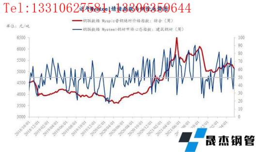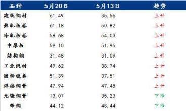 具体各品种指数来看,5月20日建筑厚壁无缝钢管情绪指数为61.49,较5月13日回升25.93;热轧板卷情绪指数为61.18,较5月13日回升10.36;冷轧板卷情绪指数为58.68,较5月13日回升4.65;中厚板情绪指数为59.1,较5月13日回升7.15;结构钢情绪指数为31.48,较5月13日回升0.39;工业线材情绪指数为49.62,较5月13日回升10.88;镀锌板卷情绪指数为51.39,较5月13日回升13.88;焊接厚壁钢管情绪指数为47.94,较5月13日回升0.46;无缝厚壁钢管情绪指数为13.07,较5月13日回落22.16;带钢情绪指数为44.12,较5月13日回落4.32。