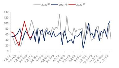 俄乌冲突以来,球团的供应确实受到一定影响,但从海关进口数据来看,今年1-2月份乌克兰球团月度进口量也就是在20万吨附近,折合每周约5万吨;而从图2中可以看出,2月中以来国产球团产量持续增加,从38家球团厂周度产量来看,球团产量由111.05万吨增至147.28万吨(2022年2月21日与2022年4月初相比,下文时间点同上),114家无缝厚壁钢管厂家库存中球团产量由18.86万吨/天增至21.63万吨/天,折合周度产量每周增加33.39万吨,按照代表性折算约83.48万吨,足以弥补乌克兰的影响。