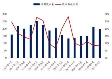 (1)进口供应:俄乌冲突下,乌克兰海运出口清零,同时在中国球团进口量中,进口乌克兰球团比例近两年均值仅有16%,2021年二季度及2022年1-2月份,进口比例更是只有8%-11%。所以虽然乌克兰海运出口被限,但对于中国国内进口球团总量影响有限,环比当前情况来看很难出现明显下降趋势。