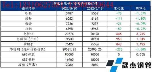 截止2022年5月20日,各原材料当日即时价格以及价格周环比情况如下: