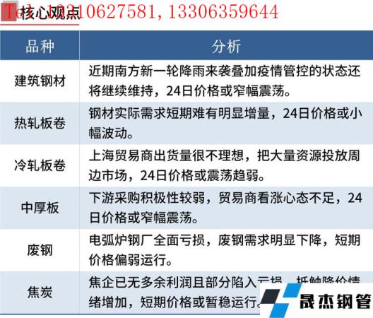 建筑厚壁无缝钢管:5月23日,全国31个主要城市20mm三级抗震螺纹钢均价4839元/吨,较上个交易日下跌10元/吨。短期来看,目前市场供应端同比持续低位,同时近期南方新一轮降雨来袭叠加疫情管控的状态还将继续维持,消费难有好转预期。目前市场仍然处于供需双弱的格局。短期市场关注点仍在于消费能否有效恢复以及雨季对于消费的影响,因此预计24日国内建筑厚壁无缝钢管现货价格窄幅震荡为主。