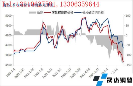 2022年以来,长沙、南昌建材市场价格在全国主要城市价格排名中,先后处于排名末位,在2022年1至3月中旬,长沙建材价格徘徊于全国排名倒数5位,此间南昌螺纹钢基价高于长沙30-40元/吨左右,南昌螺纹钢价格排名常处于倒数6-10位区间,略高于长沙。从三月中旬开始,南昌螺纹钢基价已低于长沙,到四月低,长沙、南昌两个难兄难弟全国排名双双长时间盘踞于全国排名倒数五位。进入5月后,南昌与长沙两地价差越拉越大,南昌螺纹钢基价全国排名稳稳占据着倒数第一的位置,此时长沙建材价格排名越来越高,已有较长时间处于全国中游水平,截止目前长沙与南昌的基差已拉大到140元/吨左右,具体价差变化情况如下图所示。