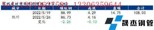 分品种来看,以杭州市场为例,本周杭州市场建筑厚壁无缝钢管总库存为102.80万吨,其中螺纹钢库存86.73万吨,周环比减少2.26万吨,降幅为2.54%;盘螺11.91万吨,周环比减少2.84万吨,降幅为19.25%;线材4.16万吨,周环比减少0.13万吨,降幅为3.03%。