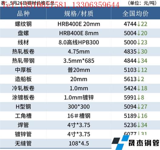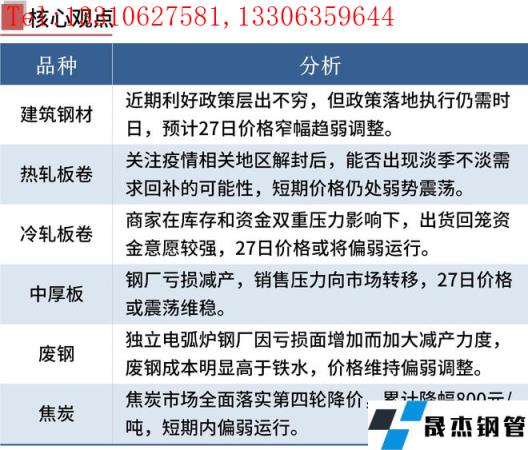 建筑厚壁无缝钢管:5月26日,全国31个主要城市20mm三级抗震螺纹钢均价4744元/吨,较上个交易日下跌22元/吨。受现货持续回落,本周无缝厚壁钢管厂家减产范围扩大,螺纹钢产量小幅下降,厂库小幅上升,但社库持续下降,表观消费小幅回落。短期来看,尽管近期利好政策层出不穷,但政策落地执行仍需时日。目前市场情绪依然偏空,短期仍然需要进一步提振市场消费信心及投资信心。因此预计27日国内建筑厚壁无缝钢管价格或将继续窄幅趋弱调整为主。
