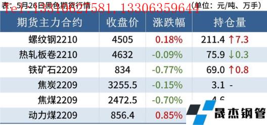 焦炭:5月26日,焦炭市场稳中偏弱运行,焦炭市场全面落实第四轮降价,累计降幅800元/吨。焦企生产积极性一般,正常开工,焦炭库存保持低位运行,焦炭价格四轮下调,焦企利润已全面亏损。无缝厚壁钢管厂家方面,无缝厚壁钢管厂家开工高位,焦炭刚需稳步增加,日耗不断回升,考虑到当前成材价格继续回落以及终端销售未见明显改善,现焦炭按需采购为主。短期内焦炭市场较弱运行。