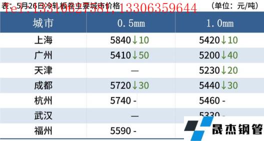 冷轧板卷:5月26日,全国24个主要城市1.0mm冷卷均价5424元/吨,较上个交易日下跌18元/吨。今日黑色系期货未见止跌迹象,市场心态仍较为悲观。据部分市场反馈,当前市场商家在库存和资金双重压力影响下,商家出货回笼资金意愿较强,其低价成交尚可,高价成交较为艰难。库存方面,据不完全统计,现冷轧无缝厚壁钢管厂家库存41.78万吨,周环比减少2.36万吨,社会库存138.46万吨,周环比增加1.17万吨,周消费量84.05万吨,环比增加0.16万吨。综合来看,故预计27日国内冷轧板卷价格或将偏弱运行。