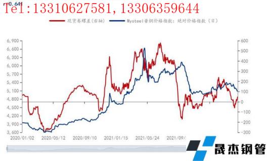 从上述五个阶段,盘面卷螺差在钢价上行中更容易走高,在钢价下跌中更容易走低(第一阶段、第二阶段),但也会出现一定的分化。在第三阶段,为贯彻实施碳达峰、碳中和,无缝厚壁钢管厂家供应减少、供需错配,此时建筑厚壁无缝钢管供应大幅收缩,虽然钢价暴涨,但盘面卷螺差高位震荡。经济周期上行时,制造业需求向好,卷板涨势更好;反之在经济下行周期,制造业需求萎缩,卷板更多是跟随建筑厚壁无缝钢管趋势波动。第四阶段、第五阶段,钢价暴跌后筑底反弹,盘面卷螺差则继续震荡走势,但高点降低,反映了在经济下行周期,制造业表现低迷,为稳增长建筑业表现会相对好些。