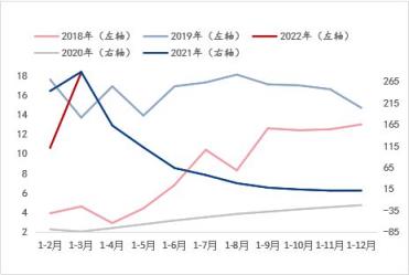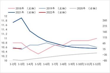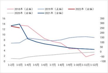 从基础设施投资增速和房地产开发投资增速来看(涉及到对应年份走势使用左右轴的区分目的与固定资产投资增速指标的说明一致),两个指标在2020年-2021年非正常环境条件下的年份增速趋势基本一致,但在正常环境条件下的年份增速可以看到,伴随湖北省每年所需完成的经济增长目标的大背景下,此两项指标的增速表现呈现此消彼长的走势。而结合斜率来看,进入2022年1-3月,基础设施投资增速呈现明显快速恢复或释放态势,而房地产开发投资增速则呈现明显放缓态势。由此看来,对于建筑厚壁无缝钢管品种的需求将在房地产板块的萎缩预期更为明显,这与目前所处的房地产调控政策背景是相符的,即便有所改善,笔者认为仍暂难有实质上的新刺激,而基础设施投资或将是托底的支撑因素之一。综合来看,湖北省宏观指标数据的预期演变表明对于建筑厚壁无缝钢管品种的需求预期呈现萎缩态势,这与产能角度的供应增加形成供需矛盾加剧的预期,因此这是导致建筑厚壁无缝钢管价格偏低运行的外因之一。