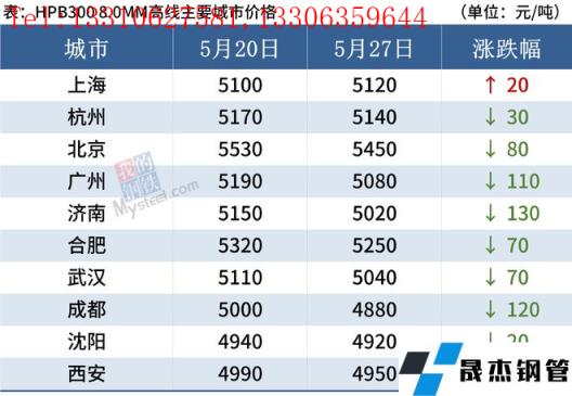 据监测,截至5月27日,全国主要城市20mm三级抗震螺纹钢均价4765元/吨,较5月20日下跌84元/吨;8.0mmHPB300高线均价5023/吨,较5月20日下跌78元/吨。