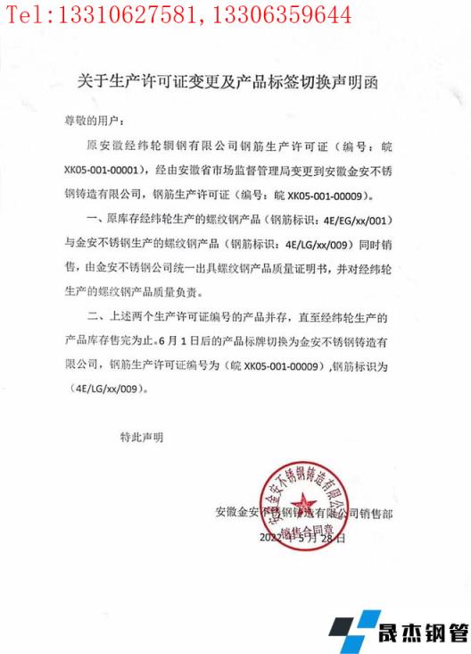 二、上述两个生产许可证编号的产品并存,直至经纬轮生产的产品库存售完为止。6月1日后的产品标牌切换为金安不锈钢铸造有限公司,钢筋生产许可证编号为(皖XK05-001-00009),钢筋标识为(4E/LG/xx/009)。