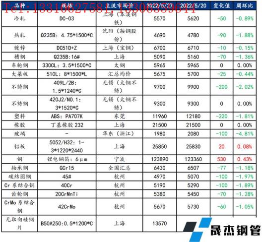截止2022年5月27日,各原材料当日即时价格以及价格周环比情况如下: