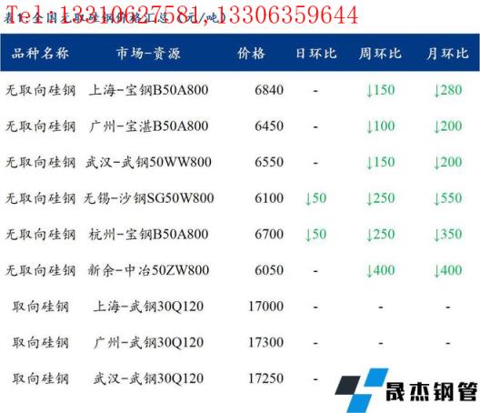 无锡市场:无锡无取向硅钢价格跌50元/吨,800系宝钢6850元/吨、武钢6550元/吨、沙钢6100元/吨、鞍钢6300元/吨,市场成交偏弱。据商户反馈,近期来国内钢市震荡下行,市场预期偏悲观,电机下游行业接单情况偏差,多观望为主;另外当地贸易商多暗降抛货为主,且多倒挂严重,更多关注近期无缝厚壁钢管厂家调价政策以及无缝厚壁钢管厂家追补情况。综合来看,预计明日无锡市场硅钢现货多震荡趋弱运行