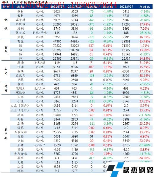 本周大宗商品价格涨跌互现:其中厚壁无缝钢管价格走势疲软,小幅下跌;不锈钢价格延续下跌趋势;有色金属价格整体下跌;石化方面,本周国际原油价格上涨;成品油价格延续小涨;LNG价格持续小幅下跌;建筑材料方面,水泥价格需求支撑不足延续跌势,混凝土价格略有下跌,螺纹钢价格继续小幅下行;农产品方面,农产品价格涨跌互现,其中豆油价格始终高位运行,涨幅居前;大肉食鸡小幅上涨;苹果库内交易氛围清淡,行情运行显疲,跌幅居前;鸡蛋价格小幅下滑。