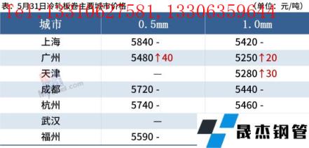 冷轧板卷:5月31日,全国24个主要城市1.0mm冷卷均价5434元/吨,较上个交易日上涨6元/吨。由于本月无缝厚壁钢管厂家结算多不理想,与市场价格形成倒挂,再加上需求持续疲软,现货市场跟涨动力不足,商家多以稳价出货回笼资金为主,今日整体成交表现一般。据悉,上海6月1日仓库取消通行证提货要求,仓库有望恢复正常加工提货,由于临近解封,上海市场观望情绪较为浓厚,悲观情绪有所改善。预计1日国内冷轧板卷价格或将震荡运行为主。