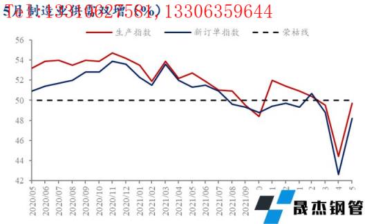 二、5月制造业PMI指数呈供需双增的态势,需求回升力度大于供给,大体符合前期判断。4月笔者发布的文章《4月制造业PMI指数低迷,未来厚壁无缝钢管消费何去何从?》中便提到,随着我国经济逐步复苏,需求复苏的弹性将快于供给端。从数据来看,5月新订单指数大幅回升5.6个百分点至48.2%,回升幅度高于生产指数。据国家统计局数据,5月专用设备、汽车等行业生产指数较上月大幅上升10个百分点以上,升至扩张区间;石油煤炭及其他燃料加工、化学原料及化学制品、黑色金属冶炼及压延加工等行业新订单指数重回扩张区间。